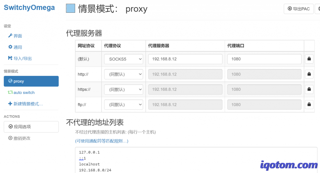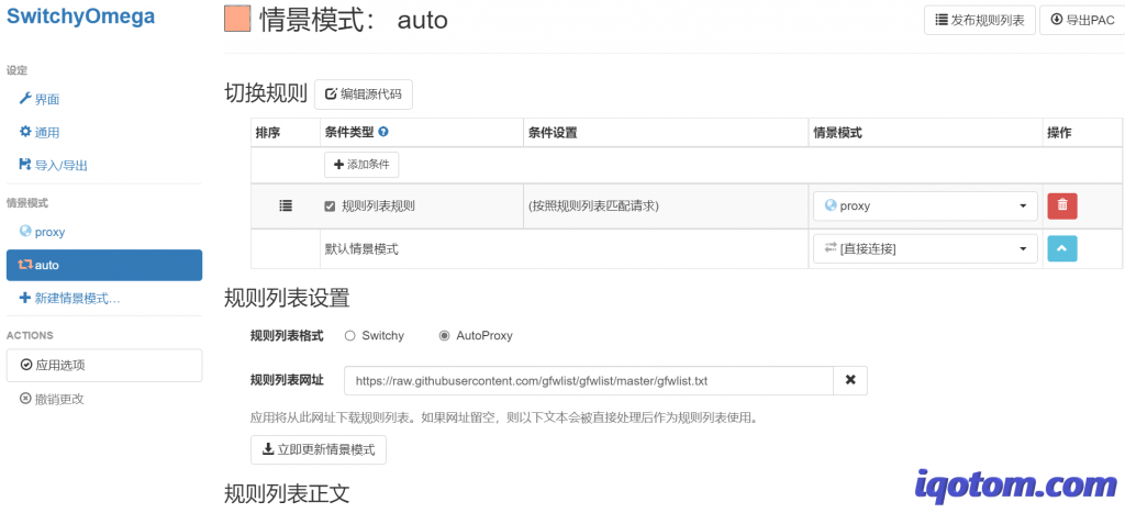 规则列表使用上面设置好的proxy,默认情景选择直连,这样规则内的地址就会自动走代理访问